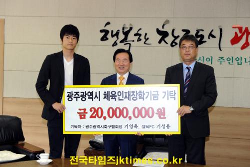 °¿îÅ ±¤ÁÖ±¤¿ª½ÃÀåÀº 20ÀÏ ¿ÀÀü 3Ãþ Á¢°ß½Ç¿¡¼ ±â¼º¿ë ¼±¼ö ºÎÀÚ¿¡°Ô ±¤ÁÖüÀ°ÀÎÀç ÀåÇбâ±Ý 2õ¸¸¿øÀ» Àü´Þ