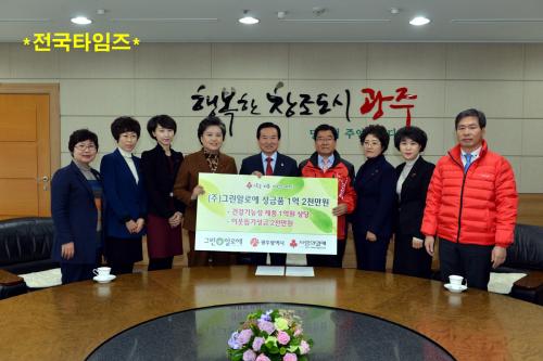 °¿îÅ ±¤ÁÖ±¤¿ª½ÃÀåÀº 21ÀÏ ¿ÀÀü ½Ãû 3Ãþ Á¢°ß½Ç¿¡¼ (ÁÖ)±×¸°¾Ë·Î¿¡ Á¤±¤¼÷ ´ëÇ¥¿¡°Ô ÀÌ¿ôµ½±â¼º±Ý 1¾ï2000¸¸¿øÀ» Àü´Þ¹Þ¾Ò´Ù.