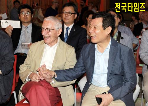 À±ÀåÇö ±¤ÁÖ½ÃÀå ÇÁ·¹½º ÄÁÆÛ·±½ºÇà»ç Áß ¾Ë·¹»êµå·Î ¸Çµð´Ï(Alessandro Mendini)¿Í ´ÙÁ¤ÇÏ°Ô ¼ÕÀ» Àâ°í ´ëȸ¦ ³ª´©°í ÀÖ´Ù.