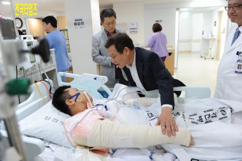 À±ÀåÇö ±¤ÁÖ±¤¿ª½ÃÀåÀº 18ÀÏ ¼¿ï ÇÑÀüº´¿ø¿¡¼ Ä¡·á ÁßÀÎ ³ë¼®ÈÆ ¼Ò¹æÀåÀ» ã¾Æ À§¹®Çϰí ÀÖ´Ù. ³ë ¼Ò¹æÀåÀº Áö³ 14ÀÏ ¿ÀÈÄ ±¤ÁÖ ¼±¸ ±ÝÈ£µ¿ Àü½ÅÁÖ¿¡¼ ¹úÁýÀ» Á¦°ÅÇÏ´Ù °¨ÀüµÅ È»óÀ» ÀÔ¾ú´Ù.