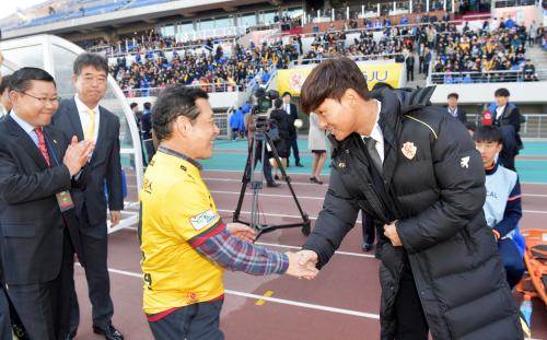 À±ÀåÇö ±¤ÁÖ±¤¿ª½ÃÀåÀÌ 4ÀÏ ¿ÀÈÄ ¼±¸ ±¤ÁÖ¿ùµåÄŰæ±âÀå¿¡¼ ¿¸° 2017 KEBÇϳªÀºÇà K¸®±× Ŭ·¡½Ä ±¤ÁÖFC¿Í ´ë±¸FCÀÇ È¨ °æ±â °³¸·½Ä¿¡ Âü¼®ÇØ ³²±âÀÏ ±¤ÁÖFC °¨µ¶°ú ¾Ç¼ö¸¦ ³ª´©°í ÀÖ´Ù.
