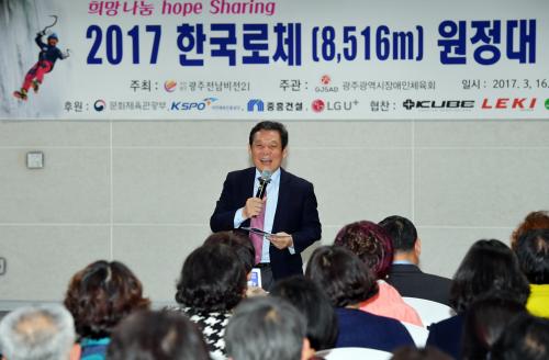 À±ÀåÇö ±¤ÁÖ±¤¿ª½ÃÀåÀÌ 16ÀÏ ¿ÀÈÄ ½Ãû ÁßȸÀǽǿ¡¼ ¿¸° ±èÈ«ºó Àå¾Ö»ê¾ÇÀÎÀÌ ¿øÁ¤ ´ëÀåÀ¸·Î Âü¿©ÇÏ´Â ¡®Èñ¸Á³ª´® 2017 Çѱ¹ ·Îü(8,516m)¿øÁ¤´ë¡¯ ¹ß´ë½Ä¿¡ Âü¼®ÇØ °Ý·Á»ç¸¦ Çϰí ÀÖ´Ù.