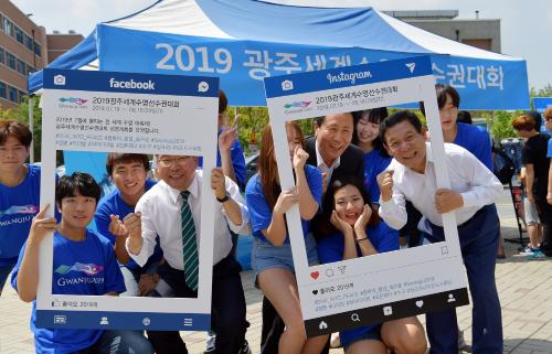 À±ÀåÇö ±¤ÁÖ±¤¿ª½ÃÀå(¿À¸¥ÂÊ)ÀÌ 22ÀÏ ¿ÀÈÄ ±¤»ê±¸ ³²ºÎ´ë ½Ã¸³±¹Á¦¼ö¿µÀå¿¡¼ ¿¸° ¡®Á¦89ȸ µ¿¾Æ¼ö¿µ´ëȸ °³È¸½Ä¡¯À» ¸¶Ä£ µÚ 2019 ±¤ÁÖ¼¼°è¼ö¿µ¼±¼ö±Ç´ëȸ È«º¸ºÎ½º ¾Õ¿¡¼ ÀÌÀº¹æ ±¤ÁÖ½ÃÀÇȸ ÀÇÀå, Á¶¿µÅà ±¤ÁÖ¼¼°è¼ö¿µ¼±¼ö±Ç´ëȸ Á¶Á÷À§¿øÈ¸ »ç¹«ÃÑÀå, ¼Æ÷ÅÍÁîµé°ú ÇÔ²² È«º¸¿ë »çÁøÀ» ÃÔ¿µÇϰí ÀÖ´Ù.