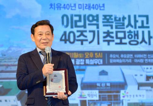 À±ÀåÇö ±¤ÁÖ±¤¿ª½ÃÀå(¿ÞÂÊ)ÀÌ Áö³ 11ÀÏ ¿ÀÈÄ ÀüºÏ Àͻ꿪¿¡¼ ¿¸° 'À̸®¿ª Æø¹ß 40ÁÖ³â Ã߸ðÇà»ç'¿¡ Âü¼®ÇØ Á¤ÇåÀ² ÀÍ»ê½ÃÀåÀ¸·ÎºÎÅÍ ¸í¿¹ ÀÍ»ê½Ã¹ÎÁõÀ» ¹Þ°í ÀÖ´Ù. À±ÀåÇö ½ÃÀåÀº 1977³â ´ç½Ã À°±º ±ºÀǰüÀ¸·Î º¹¹« Áß À̸®¿ª Æø¹ß»ç°í¸¦ Á¢Çϰí Ãʵ¿ ´ëÃ³ÇØ ¸¹Àº »ý¸íÀ» »ì¸®°í ¾à 3°³¿ù°£ »ç°í ÇöÀå¿¡¼ ȯÀÚµéÀ» Ä¡·áÇß´Ù.