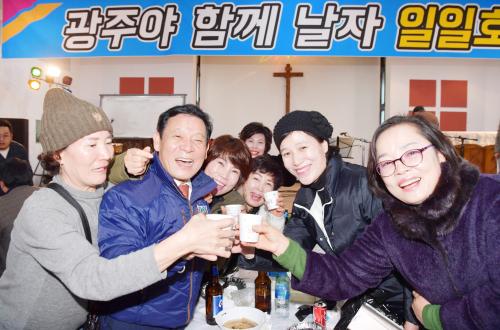 À±ÀåÇö ±¤ÁÖ±¤¿ª½ÃÀåÀÌ 29ÀÏ ¿ÀÈÄ ÃµÁÖ±³ ±¤ÁÖ´ë±³±¸ ºÏµ¿ ¼º´ç ÁöÇÏ´ë½Ä´ç¿¡¼ Çѱ¹³ëÃÑ ±¤ÁÖº»ºÎ, °ø°ø¿î¼ö ±¤ÁÖÀü³²ÁöºÎ, ±¤ÁÖÀºÇà³ëµ¿Á¶ÇÕ, ±â¾ÆÀÚµ¿Â÷Áöȸ µî ¼Ò¼Ó Á¶ÇÕ¿øµéÀÌ Âü¿©ÇÑ °¡¿îµ¥ ¿¸° ±¤ÁÖÇüÀÏÀÚ¸® ¼º°øÁ¤ÂøÀ» À§ÇÑ ¡®¹®È¾ß ³îÀÚ¡¯ ÀÏÀÏÈ£ÇÁ¿¡ Âü¼®ÇØ Á¶ÇÕ¿øµé°ú ±â³äÃÔ¿µÀ» Çϰí ÀÖ´Ù.