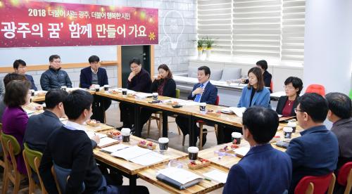 ÀåÇö ±¤ÁÖ±¤¿ª½ÃÀåÀÌ 18ÀÏ ¿ÀÀü ½Ãû 3Ãþ Çù¾÷ȸÀǽǿ¡¼ ¡®±¤ÁÖÀÇ ²Þ ÇÔ²² ¸¸µé¾î°¡¿ä¡¯¶ó´Â ÁÖÁ¦·Î ¿¸° ¡®ÁÖ¿ä¾÷¹« °øÀ¯ ¹ÌÆÃ¡¯¿¡ Âü¼®ÇØ Àç³´ëÀÀ°ú, µµ·Î°ú Á÷¿øµé°ú À̾߱⸦ ³ª´©°í ÀÖ´Ù.