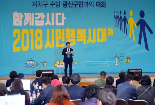 À±ÀåÇö ±¤ÁÖ±¤¿ª½ÃÀåÀÌ 26ÀÏ ¿ÀÈÄ 2018 ÀÚÄ¡±¸ ¸¶Áö¸· ¼ø¹æÁöÀÎ ±¤»ê±¸Ã» ´ëȸÀǽǿ¡¼ ¿¸° '±¤»ê±¸¹Î°úÀÇ ´ëÈ'¿¡¼ °ÇÀÇ»çÇ×À» ûÃëÇÏ°í °ü·Ã Áú¹®¿¡ ´äº¯Çϰí ÀÖ´Ù.