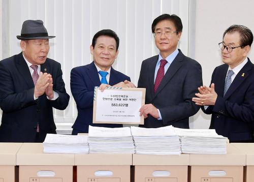 À±ÀåÇö ±¤ÁÖ±¤¿ª½ÃÀå(¿ÞÂÊ ³×¹øÂ°)ÀÌ 9ÀÏ ¿ÀÀü ¼¿ï ±¹È¸º»°ü¿¡¼ ¿¸° '5¡¤18¹ÎÁÖȿ Çå¹ýÀü¹® ¼ö·ÏÀ» À§ÇÑ ´ë±¹¹Î ¼¸íºÎ Àü´Þ½Ä'¿¡ Âü¼®ÇØ È²¿Çå ±¹È¸ÀÇÀå ºñ¼½ÇÀå(¿ÞÂÊ ´Ù¼¸Â°)¿¡°Ô ¼¸íºÎ¸¦ Àü´ÞÇϰí ÀÖ´Ù.