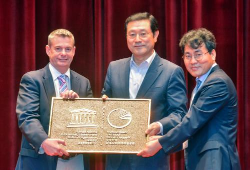 À̿뼷 ±¤ÁÖ±¤¿ª½ÃÀå(°¡¿îµ¥)°ú ÀÌÀ翵 Àü³²ÇàÁ¤ºÎÁö»ç(¿À¸¥ÂÊ)°¡ 10ÀÏ ¿ÀÈÄ ¼±¸ ±è´ëÁßÄÁº¥¼Ç¼¾ÅÍ 4Ãþ ÄÁº¥¼ÇȦ¿¡¼ ¿¸° '¹«µî»ê±Ç À¯³×½ºÄÚ ¼¼°èÁöÁú°ø¿ø ÀÎÁõ±â³ä ºñÀü¼±Æ÷½Ä'¿¡¼ ÆÐÆ®¸¯ ¸ÆÅ°¹ö À¯³×½ºÄÚ ¼¼°èÁöÁú°ø¿ø »ç¹«ÃÑÀå(¿ÞÂÊ)À¸·Î Àü´Þ ¹ÞÀº ¹«µî»ê±Ç À¯³×½ºÄÚ ¼¼°èÁöÁú°ø¿ø ÀÎÁõ¼ µ¿ÆÇÀ» µé°í ±â³äÃÔ¿µÀ» Çϰí ÀÖ´Ù.