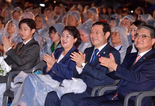 ±¤ÁÖ±¤¿ª½ÃÀå(¿À¸¥ÂÊ µÎ¹øÂ°)°ú ¿µºÎÀÎ ±èÁ¤¼÷ ¿©»ç(¿À¸¥ÂÊ ¼¼¹øÂ°) µî ³»ºóµéÀÌ 6ÀÏ Àú³á ºÏ±¸ ¿ëºÀµ¿ ±¤ÁÖºñ¿£³¯·¹ Àü½Ã°ü ¾Õ ¾ß¿Ü ±¤Àå¿¡¼ ¿¸° '2018 ±¤ÁÖºñ¿£³¯·¹ °³¸·½Ä'¿¡ Âü¼®ÇØ ¹Ú¼ö¸¦ Ä¡°í ÀÖ´Ù.