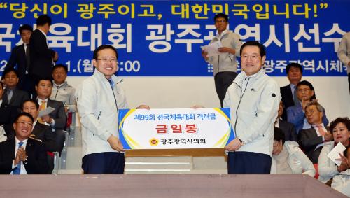 À̿뼷 ±¤ÁÖ±¤¿ª½ÃÀå(¿À¸¥ÂÊ)ÀÌ 1ÀÏ ¿ÀÈÄ ¼±¸ ¿°ÁÖüÀ°°ü¿¡¼ ¿¸° Á¦99ȸ Àü±¹Ã¼À°´ëȸ ±¤Áֽü±¼ö´Ü °á´Ü½Ä¿¡ Âü¼®ÇØ ±èµ¿Âù ±¤ÁÖ½ÃÀÇȸ ÀÇÀå(¿ÞÂÊ)À¸·ÎºÎÅÍ °Ý·Á±ÝÀ» Àü´Þ¹Þ°í ÀÖ´Ù.
