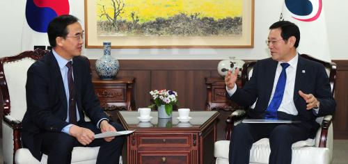 À̿뼷 ±¤ÁÖ±¤¿ª½ÃÀåÀÌ 2ÀÏ ¿ÀÈÄ ¼¿ïÁ¤ºÎû»ç¿¡¼ Á¶¸í±Õ ÅëÀϺΠÀå°üÀ» ¸¸³ª ¡®2019 ±¤ÁÖ¼¼°è¼±¼ö±Ç¼ö¿µ´ëȸ¡¯ ºÏÇѼ±¼ö´Ü Âü°¡¿Í '°¡À»ÀÌ ¿Ô´Ù' ºÏÇÑ¿¹¼ú´Ü ±¤ÁÖ ÃÊûÀ» °ÇÀÇÇϰí ÀÖ´Ù.