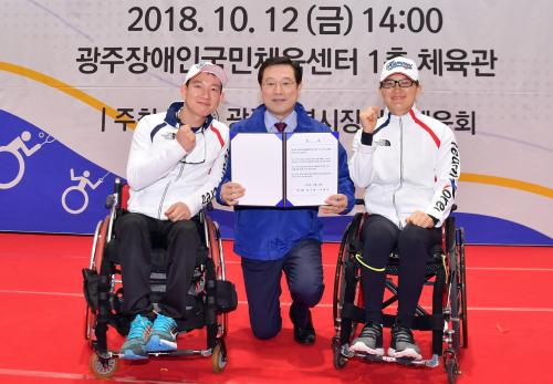 À̿뼷 ±¤ÁÖ±¤¿ª½ÃÀå(°¡¿îµ¥)ÀÌ 12ÀÏ ¿ÀÈÄ ¼±¸ ±¤ÁÖÀå¾ÖÀα¹¹ÎüÀ°¼¾ÅÍ¿¡¼ ¿¸° 'Á¦38ȸ Àü±¹Àå¾ÖÀÎüÀ°´ëȸ ±¤ÁÖ¼±¼ö´Ü °á´Ü½Ä'¿¡ Âü¼®ÇØ ¸í±âÈ«(¿ÞÂÊ), ±è¼¼Á¤(¿À¸¥ÂÊ) ¼±¼ö ´ëÇ¥·ÎºÎÅÍ ´ëȸ ¼±ÀüÀ» ´ÙÁüÇÏ´Â ¼±¼¸¦ ¹ÞÀº µÚ ±â³äÃÔ¿µÀ» Çϰí ÀÖ´Ù.