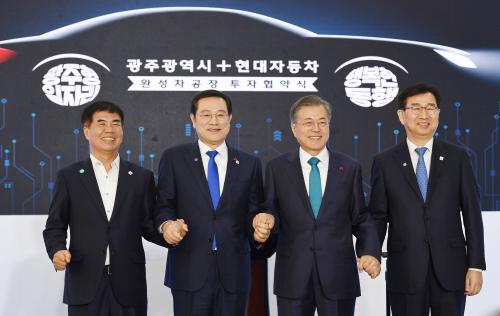 ¹®ÀçÀÎ ´ëÅë·É°ú À̿뼷 ±¤ÁÖ±¤¿ª½ÃÀå, ÀÌ¿øÈñ Çö´ëÂ÷ ´ëÇ¥ÀÌ»ç µîÀÌ 31ÀÏ ¿ÀÈÄ ½Ãû 1Ãþ ½Ã¹ÎȦ¿¡¼ ¿¸° '±¤ÁÖ±¤¿ª½Ã-Çö´ëÀÚµ¿Â÷ ÅõÀÚÇù¾à½Ä'¿¡ Âü¼®ÇØ Çà»ç¸¦ ¸¶Ä£ µÚ ±â³äÃÔ¿µÀ» Çϰí ÀÖ´Ù