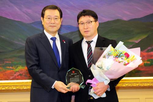 À̿뼷 ±¤ÁÖ±¤¿ª½ÃÀåÀÌ 7ÀÏ ¿ÀÀü ½Ãû 3Ãþ ´ëȸÀǽǿ¡¼ ¿¸° 2¿ù Á¤·ÊÁ¶È¸¿¡¼ ¿ÃÇØ ù ¡®ÀÌ´ÞÀÇ °ø¹«¿ø¡¯ ¼ö»óÀÚ·Î ¼±Á¤µÈ ±³ÅëÁ¤Ã¥°ú ¹ÚÁØ¿ »ç¹«°ü(±³Åë½Ã¼³ ´ã´ç)¿¡°Ô ½Ã»óÇÑ ÈÄ ±â³äÃÔ¿µÀ» Çϰí ÀÖ´Ù.