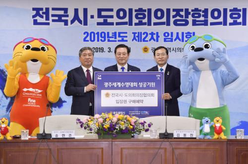 À̿뼷 ±¤ÁÖ±¤¿ª½ÃÀå(°¡¿îµ¥)ÀÌ 28ÀÏ ¿ÀÈÄ ±¤ÁÖ½ÃÀÇȸ ´ëȸÀǽǿ¡¼ ¿¸° 'Àü±¹½Ã¡¤µµÀÇȸÀÇÀåÇùÀÇȸ 2019³â Á¦2Â÷ ÀÓ½Ãȸ'¿¡ Âü¼®ÇØ ¼ÛÇÑÁØ Àü±¹½ÃµµÀÇȸÀÇÀåÇùÀÇȸÀå(¿ÞÂÊ)À¸·ÎºÎÅÍ 2019±¤ÁÖ¼¼°è¼ö¿µ¼±¼ö±Ç´ëȸÀÇ ¼º°ø °³ÃÖ¸¦ À§ÇÑ ÀÔÀå±Ç ±¸¸Å ¿¹¾àÀ» ÇÑ µÚ ±â³äÃÔ¿µÀ» Çϰí ÀÖ´Ù.