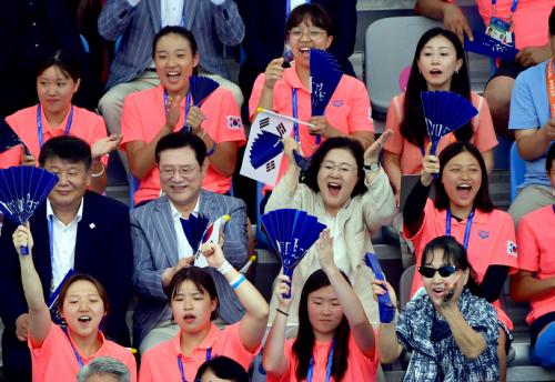 ¹®ÀçÀÎ ´ëÅë·ÉÀÇ ºÎÀÎ ±èÁ¤¼÷ ¿©»ç¿Í À̿뼷 2019 ±¤ÁÖ¼¼°è¼ö¿µ¼±¼ö±Ç´ëȸ Á¶Á÷À§¿øÀå °â ±¤ÁÖ±¤¿ª½ÃÀåÀÌ 23ÀÏ ¿ÀÀü ±¤»ê±¸ ³²ºÎ´ëÇб³ ¼ö±¸°æ±âÀå¿¡¼ ¿¸° ³²ÀÚ ¼ö±¸ Çѱ¹-´ºÁú·£µåÀÇ °æ±â¸¦ °ü¶÷Çϸç Çѱ¹ ´ëÇ¥ÆÀÀ» ÀÀ¿øÇϰí ÀÖ´Ù.