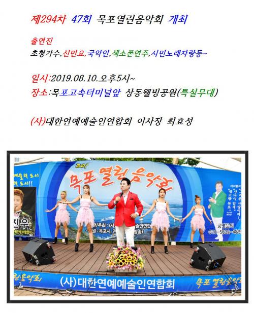 Á¦294Â÷ 47ȸ ¸ñÆ÷¿¸°À½¾Çȸ °³ÃÖ (»ç)´ëÇÑ¿¬¿¹¿¹¼úÀο¬ÇÕȸ 2019.08.10(Åä)¿ÀÈÄ5½Ã~