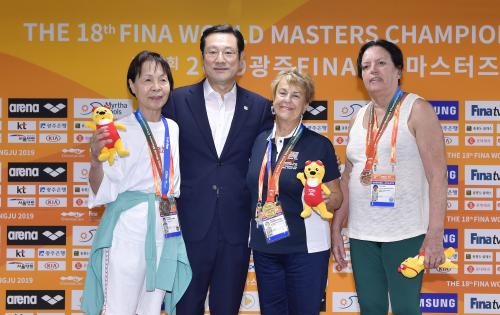 À̿뼷 ±¤ÁÖ¼¼°è¸¶½ºÅÍÁî¼ö¿µ¼±¼ö±Ç´ëȸ Á¶Á÷À§¿øÀå °â ±¤ÁÖ±¤¿ª½ÃÀåÀÌ 15ÀÏ ¿ÀÈÄ ±¤»ê±¸ ³²ºÎ´ë ¸ÞÀÎÇÁ·¹½º¼¾ÅÍ ³»¿¡ ¸¶·ÃµÈ ¸¶½ºÅÍÁî´ëȸ ½Ã»ó½ÄÀå¿¡¼ °æ¿µ ¿©ÀÚ °³ÀÎÈ¥¿µ 200m °æ±â ÀÔ»óÀڵ鿡°Ô ¸Þ´ÞÀ» ¼ö¿©ÇÑ µÚ ±â³äÃÔ¿µÀ» Çϰí ÀÖ´Ù.