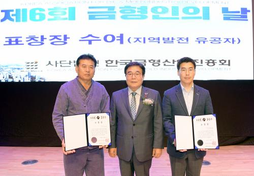 À̺´ÈÆ ±¤ÁÖ±¤¿ª½Ã ¹®È°æÁ¦ºÎ½ÃÀåÀÌ 11ÀÏ ¿ÀÈÄ ¼±¸ ±è´ëÁßÄÁº¥¼Ç¼¾ÅÍ 1Ãþ ´Ù¸ñÀûȦ¿¡¼ ¿¸° ¡®Á¦16ȸ ±ÝÇüÀÎÀÇ ³¯ Çà»ç¡¯¿¡ Âü¼®ÇØ ±ÝÇü»ê¾÷ ¹ßÀü¿¡ °øÇåÇÑ À¯°øÀÚ¿¡°Ô ǥâÀ» ¼ö¿©ÇÑ ÈÄ ±â³äÃÔ¿µÀ» Çϰí ÀÖ´Ù.