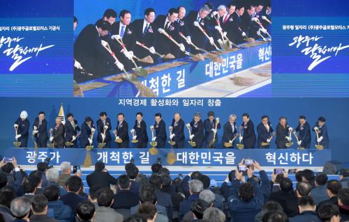 À̿뼷 ±¤ÁÖ±¤¿ª½ÃÀåÀÌ 26ÀÏ ¿ÀÀü ±¤»ê±¸ ºû±×¸°±¹°¡»ê¾÷´ÜÁö¿¡¼ ¿¸° '¢ß±¤Áֱ۷ιú¸ðÅͽº' ±â°ø½Ä¿¡ Âü¼®ÇØ ¼ºÀ±¸ð »ê¾÷ÀÚ¿øºÎ Àå°ü, À̸ñÈñ ÀÏÀÚ¸® À§¿øÈ¸ ºÎÀ§¿øÀå, ÀÌÀç°© °í¿ë³ëµ¿ºÎ Àå°ü, ÀÌ¿øÈñ Çö´ëÀÚµ¿Â÷ ´ëÇ¥ÀÌ»ç, ¹Ú±¤Å ±¤Áֱ۷ιú¸ðÅͽº ´ëÇ¥, ±èµ¿Âù ±¤ÁÖ½ÃÀÇȸ ÀÇÀå µî ³»ºóµé°ú °ø»çÀÇ ½ÃÀÛÀ» ¾Ë¸®´Â ù »ð ¶ß±â ÆÛÆ÷¸Õ½º¸¦ Çϰí ÀÖ´Ù.