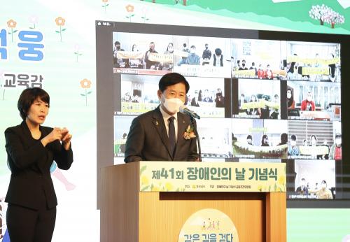 Àå¼®¿õ ±³À°°¨Àº 4¿ù 20ÀÏ(È) ¿ÀÀü ¸ñÆ÷½Å¾ÈºñġȣÅÚ¿¡¼ ¿¸° Á¦41ȸ Àå¾ÖÀÎÀdz¯ ±â³ä½Ä¿¡ Âü¼®ÇØ À̰°ÀÌ ¹àÈ÷°í, ¡°ÇÑ ¸íÀÇ Àå¾ÖÇлýµµ Æ÷±âÇÏÁö ¾Ê´Â Àü³²±³À°À» ¹Ýµå½Ã ½ÇÇöÇϰڴÙ.¡±°í ´ÙÁüÇß´Ù.