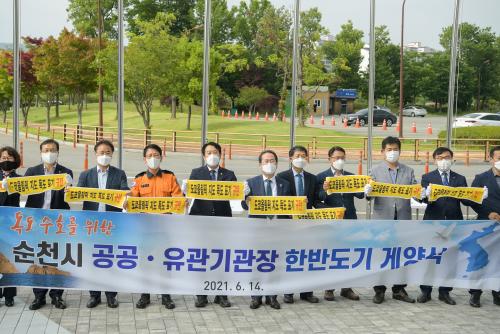 À̳¯ °Ô¾ç½Ä¿¡´Â Çã¼® ¼øÃµ½ÃÀåÀ» ºñ·ÔÇØ ÇãÀ¯ÀÎ ¼øÃµ½ÃÀÇȸ ÀÇÀå, À̽·¡ ¼¼¹«¼Àå, Çϼöö ¼øÃµ¼Ò¹æ¼Àå µî 20¿©¸íÀÇ °ø°ø¡¤À¯°ü±â°üÀåµéÀÌ Âü¼®ÇÏ¿© µ¶µµ ¼öÈ£ÀÇ ¸¶À½À» ´ã¾Æ Çѹݵµ±â¿¡ µ¶µµ¸¦ Ç¥±âÇØ °Ô¾çÇϰí, µµÄì¿Ã¸²ÇÈ Áöµµ¿¡ µ¶µµ Ç¥±â¸¦ Áï°¢ »èÁ¦ÇÒ °ÍÀ» Ã˱¸ÇÏ¸ç ¿Ã¸²ÇÈ Á¤½ÅÀ» ÈѼÕÇϰí Á¤Ä¡Àû ¿ª»ç¿Ö°î ÇàÀ§¸¦ ÀÏ»ï´Â ÀϺ»À» ±ÔźÇß´Ù.