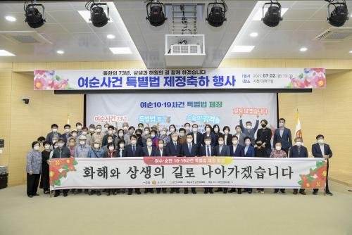 Çã¼® ¼øÃµ½ÃÀåÀº ¡°À¯Á·µéÀ» ¸ð½Ã°í ¿©¼ø10¡¤19Ưº°¹ý Åë°ú ÃàÇÏÇà»ç¸¦ ¿°Ô µÇ¾î ¸Å¿ì ±â»Ú°í ¿ª»çÀûÀÎ ³¯À̶ó »ý°¢µÈ´Ù. ¿©¼ø10¡¤19»ç°Ç ÇÇÇØÀ¯°¡Á·ÀÇ ¾ÆÇÄÀ» Ä¡À¯Çϰí Áö¿ªÀÇ ¿ª»çÀû Áø½ÇÀ» µÇã´Â Ãâ¹ßÁ¡¿¡ ¼°Ô µÇ¾ú´Ù.¡±¸é¼ ¡°¿©¼ø»ç°ÇÀÇ Áø»ó±Ô¸í°ú À§·É»ç¾÷ ±×¸®°í ¹èº¸»ó¿¡ À̸£±â±îÁö À¯°¡Á·°ú ½Ã¹Î´Üü¿Í °ü·Ã±â°ü ¸ðµÎ°¡ ÇÔ²²ÇÏ¿© ´ëÇѹα¹ ÈÇÕ°ú »ó»ýÀÇ ±æÀ» ¿¾î°¡¾ß ÇϰڴÙ.¡±°í ÀüÇß´Ù.