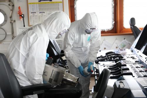 ƯÈ÷, ÃÖ Àϼ± °æºñÇÔÁ¤ ±Ù¹«ÀÚµéÀº ÇØ»ó °Ë¹®°Ë»ö ¹× ´Ü¼Ó¾÷¹«, ÀÀ±ÞȯÀÚ ÀÌ¼Û µî °¢Á¾ ÀÓ¹«¼öÇà ½Ã ¹æ¿ªÀåºñ Çʼö Âø¿ë°ú ¿ÜºÎÀÎ Á¢ÃË ÃÖ¼ÒÈ·Î ¹æ¿ªÁöħÀ» öÀúÇÏ°Ô ÀÌÇàÇϰí ÀÖ´Ù.