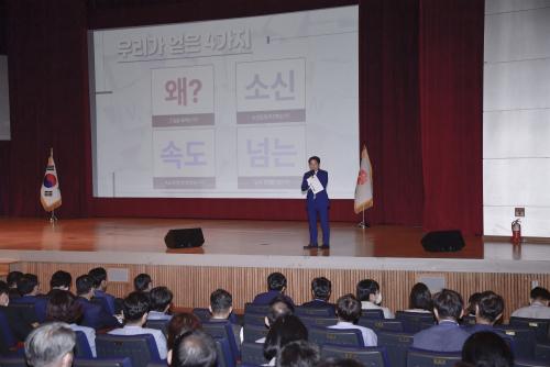 ÀÌ¾î ¡°±¤ÁÖÀÇ »õ·Î¿î ¹Ì·¡¸¦ ¸¸µé°í ½Ã¹ÎµéÀÇ ÇູÀ» À§ÇØ ÇàÁ¤¿¡¼´Â ÀÌ ÀÏÀÌ ¿Ö ÇÊ¿äÇÑÁö¿¡ ´ëÇØ ½º½º·Î ¹¯°í, »ý°¢ÀÇ ¼Óµµ°¡ ½Ã¹ÎÀÇ ¿ä±¸¿¡ µû¶ó°¡°í ÀÖ´ÂÁö, Çù¾÷ ÇÏ¸ç ¼Ò½Å ÀÖ°Ô ÀÏÀ» ÃßÁøÇϰí ÀÖ´ÂÁö ´Ã »ìÆì¾ß ÇÑ´Ù¡±¸ç ¡°Ã¥ÀÓÀº ¸®´õ°¡, ¼º°ú´Â ¸ðµÎ¿¡°Ô µ¹¾Æ°¡°Ô ÇϰڴÙ. °ÆÁ¤ÇÏÁö ¸»°í ÀڽŠÀÖ°Ô, ´ç´çÈ÷ ÇØ³ª°¡ÀÚ¡±°í ¸»Çß´Ù.