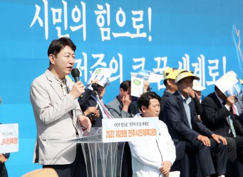 ¿ì¹ü±â ÀüÁÖ½ÃÀåÀº ´ëȸ»ç¿¡¼ ¡°ÀüÁֽùÎüÀ°´ëȸ°¡ 3³â ¸¸¿¡ °³ÃֵǴ ½Ã¹ÎüÀ°´ëȸ¿¡ ½ÂºÎ¸¦ ³Ñ¾î ÇÔ²²ÇÏ´Â Áñ°Å¿òÀ¸·Î ¾Æ¹«·± »ç°í ¾øÀÌ ´ëȸ¸¦ ¸¶ÃÄ ¼ÒÅë°ú ÈÇÕÀ¸·Î ÇູÇÏ°í ½Å¸í³ª´Â ÇÏ·ç°¡ µÇ±æ ¹Ù¶õ´Ù¡±¸é¼ ¡°500³â µ¿¾È Àü¶óµµÀÇ ¼öµµ¿´´ø ÀüÁÖÀÇ ¼ÒÁßÇÑ ¿ª»ç¸¦ ÁöÄÑ ÀüÁÖ¸¦ ´Ù½Ã, Àü¶óµµÀÇ ¼öµµ·Î ²ø¾î¿Ã¸®´Â µ¥ Èû¾²°Ú´Ù¡±°í ¸»Çß´Ù.