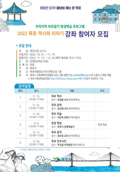 À̹ø °Á´ Áö¿ª Àü¹®°¡µéÀÇ ´Ù¾çÇÑ °ÀǸ¦ ÅëÇØ ¸ñÆ÷ÀÇ ¿ª»ç¿Í ¹®È, ¿¹¼ú µîÀ» ü°èÀûÀ¸·Î ¹è¿ï ¼ö ÀÖ´Â ±³À° ÇÁ·Î±×·¥À¸·Î ¿À´Â 11¿ù 15ÀϺÎÅÍ 12¿ù 20ÀϱîÁö ¸ÅÁÖ È¿äÀÏ ¿ÀÈÄ 3~5½Ã Áö³´Þ °³°üÇÑ ¸ñÆ÷¾î¿ï¸²µµ¼°ü ¹®È±³½Ç(1Ãþ)¿¡¼ 6ȸ(ÀÌ·Ð 5ȸ, ÇöÀåÇнÀ 1ȸ)¿¡ °ÉÃÄ ¹«·á·Î ÁøÇàµÈ´Ù.