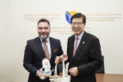 µÎ ¹øÂ° ¹æ¹®±¹ÀÎ º¸½º´Ï¾ÆÇ츣ü°íºñ³ª¿¡ µµÂøÇÑ ¹ÚÇüÁØ Æ¯»ç´Â ÇöÁö½Ã°¢À¸·Î 12¿ù 2ÀÏ ¿ÀÀü 10½Ã ÄÚ»þ¶óÃ÷ ´ë¿Ü¹«¿ª°æÁ¦ºÎ Àå°üÀ» ¸¸³ª Çѱ¹°ú º¸½º´Ï¾ÆÇ츣ü°íºñ³ª¿ÍÀÇ °æÁ¦Çù·Â È®´ë¸¦ Á¦¾ÈÇßÀ¸¸ç, ¾ç±¹ Çù·ÂÀÇ Á¦µµÀû ±â¹ÝÀ» Á¶¼ºÇϱâ À§ÇØ ¿ì¸®³ª¶ó°¡ Á¦¾ÈÇÑ °æÁ¦Çù·ÂÇùÁ¤(Agreement on Economic Cooperation)*¿¡ ´ëÇÑ ´ä½ÅÀ» ¿äûÇß´Ù. ¶ÇÇÑ ºÎ»ê»ó°øÈ¸ÀǼÒ(ȸÀå ÀåÀÎÈ) ȸÀå´ÜÀ» ¼Ò°³Çϸç, ÅõÀÚ ¹× °æÁ¦Çù·Â ÁõÁøÀ» À§ÇÑ ±ä¹ÐÇÑ Çù·ÂÀ» ´çºÎÇß´Ù.