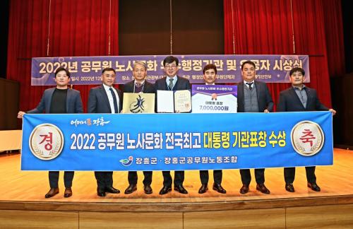 ÀåÈﱺÀº 7ÀÏ Á¤ºÎ¼¼Á¾Ã»»ç¿¡¼ ¿¸° ¡®2022³â °ø¹«¿ø ³ë»ç¹®È ¿ì¼öÇàÁ¤±â°ü ÀÎÁõÁ¦¡¯ ½Ã»ó½Ä¿¡¼ ¹Ù¶÷Á÷ÇÑ ³ë»ç°üÇà ½Çõ°ú ÇÕ¸®Àû ³ë»ç¹®È ¼±µµ ÁöÀÚü·Î ÀÎÁ¤¹Þ¾Æ ¡®´ëÅë·É ±â°üǥ⡯À» ¼ö»óÇß´Ù.