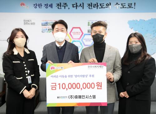 ¿ì¹ü±â ÀüÁÖ½ÃÀåÀº ¡°¸Å³â ³ª´®À» ½ÇõÇÏ¿© ÁֽŠ¢ßÈÞ¸ÞÀνýºÅÛ ±Çõ¼ö ´ëÇ¥´Ô°ú Á÷¿øµé²² °¨»çÀÇ ¸¶À½À» ÀüÇÑ´Ù¡±¸ç ¡°±âºÎÇØÁֽмº±ÝÀº µµ¿òÀÌ ÇÊ¿äÇÑ ¾ÆÀ̵鿡°Ô Èñ¸ÁÀÌ µÉ ¼ö ÀÖµµ·Ï ¼ÒÁßÇÏ°Ô »ç¿ëµÉ °Í¡±À̶ó°í ¸»Çß´Ù.