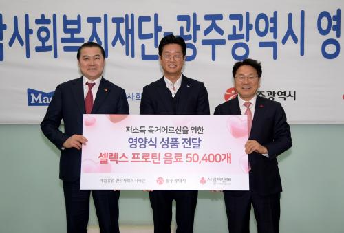 ¸ÅÀÏÀ¯¾÷ Áø¾Ï»çȸº¹ÁöÀç´ÜÀº Ȧ·Î »ç´Â ¾î¸£½ÅµéÀÇ µû¶æÇÑ °Ü¿ï³ª±â¸¦ µ½±â À§ÇØ 5800¸¸¿ø »ó´çÀÇ ¿µ¾çÀ½·á ¡®¼¿·º½º¡¯ 2100¹Ú½º 5¸¸400°³¸¦ ±¤Áֽÿ¡ Àü´ÞÇß´Ù.
