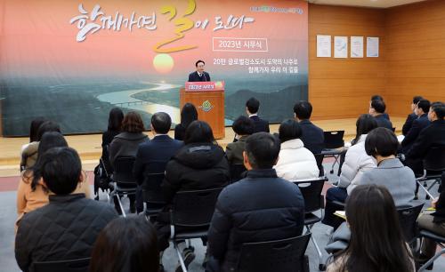 ³ªÁֽô 2ÀÏ ½Ãû»ç ´ëȸÀǽǿ¡¼ À±º´Å ½ÃÀå, °¿µ±¸ ºÎ½ÃÀå°ú ±¹¡¤¼Ò¡¤½Ç, ºÎ¼Àå, 20°³ À¾¡¤¸é¡¤µ¿Àå°ú Á÷¿ø 150¸íÀÌ Âü¼®ÇÑ °¡¿îµ¥ 2023³â ½Ã¹«½ÄÀ» °¡Á³´Ù°í ¹àÇû´Ù.
