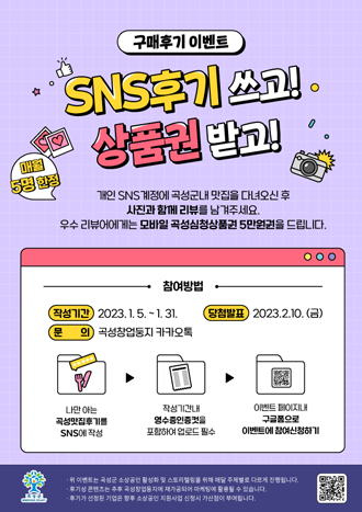 Âü¿© ¹æ¹ýÀº °î¼º Áö¿ª ³» ¼Ò»ó°øÀÎ °¡°Ô¸¦ ¹æ¹®ÇÑ µÚ °³ÀÎ SNS¿¡ ±¸¸Å¿µ¼öÁõ, »çÁø 5Àå, ±ÛÀÚ 100ÀÚ ÀÌ»ó ÀÛ¼ºÇØ Èı⸦ °Ô½ÃÇÏ¸é µÈ´Ù.