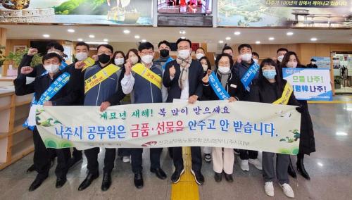 À±º´Å ³ªÁÖ½ÃÀåÀº ¡°Ã»Å¹±ÝÁö¹ý Áؼö µî û·ÅÀ» ÀÚ¹ßÀûÀ¸·Î ½ÇõÇÏ´Â ±ú²ýÇÑ ¸íÀý ¿¬ÈÞ°¡ µÇ±æ ¹Ù¶õ´Ù¡±¸ç ¡°Ã»·ÅÇÑ ³ªÁÖ °øÁ÷»çȸ´Â ³ª ÀÚ½ÅÀ¸·ÎºÎÅÍ ½ÃÀ۵ǰí û·ÅÇÑ °øÁ÷ÀÚ°¡ °ð ³ªÁֽà ÇàÁ¤ÀÇ ¾ó±¼À̶ó´Â ¸¶À½°ú °¢¿À¸¦ °¡Á®´Þ¶ó¡±°í ´çºÎÇß´Ù.
