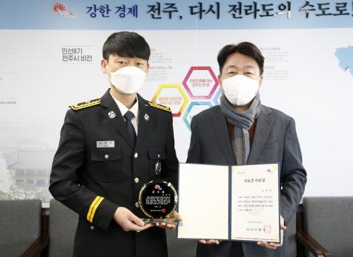 ÀüÁֽô 25ÀÏ ÀüÁÖ½ÃÀå½Ç¿¡¼ ³²¿ø¼Ò¹æ¼ ¼Ò¼Ó ±èÇüÇÐ ¼Ò¹æÀ§¿¡°Ô ¡®ÀǷοî½Ã¹Î»ó¡¯À» ¼ö¿©Çß´Ù.