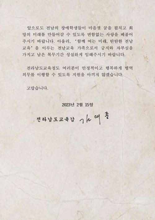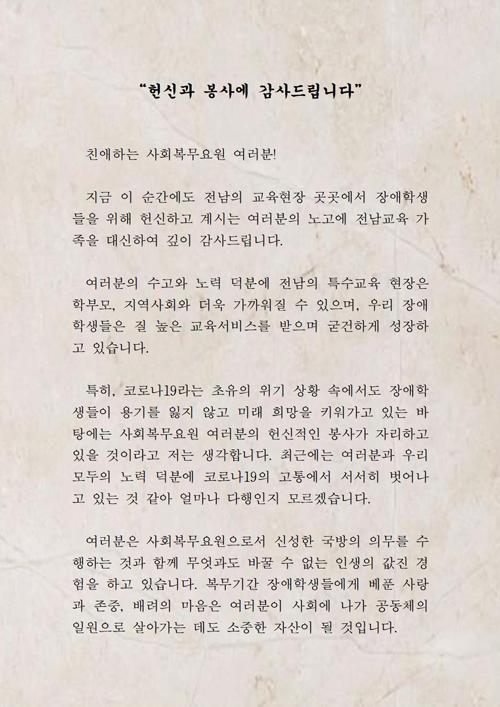 [Àü³²]±è´ëÁß Àü¶ó³²µµ±³À°°¨ÀÌ 15ÀÏ(¼ö) Ư¼öÇб³(±Þ) ¹èÄ¡ Àå¾ÖÇлý Ȱµ¿Áö¿ø »çȸº¹¹«¿ä¿ø¿¡°Ô °¨»ç¿Í °Ý·ÁÀÇ ¸¶À½À» ´ãÀº ÆíÁö¸¦ º¸³Â´Ù.