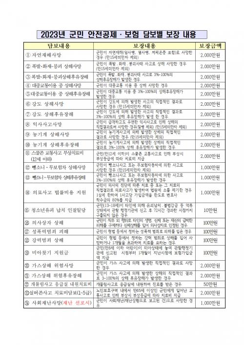º¸ÀåÇ׸ñÀº ¡âÀÚ¿¬ÀçÇØ »óÇØ»ç¸Á, ¡â³ó±â°è»ç°í »óÇØ»ç¸Á, »óÇØÈÄÀ¯ÀåÇØ, ¡âÆø¹ß¡¤ÈÀ硤ºØ±« »óÇØ»ç¸Á, »óÇØÈÄÀ¯ÀåÇØ µî ÃÑ 24Á¾¸ñÀÌ¸ç °¢ º¸ÀåÇ׸ñ¿¡ µû¶ó ÃÖ´ë 2,000¸¸ ¿ø±îÁö º¸ÀåµÇ¸ç, »ç°íÀÏ ´ç½Ã ¹«¾È±º¿¡ Áֹεî·ÏÀ» µÎ°í ÀÖ´Â ¸ðµç ±º¹Î(µî·Ï¿Ü±¹ÀÎ Æ÷ÇÔ)ÀÌ¸é ´©±¸³ª º°µµÀÇ °¡ÀÔ ÀýÂ÷ ¾øÀÌ º¸ÀåµÈ´Ù.