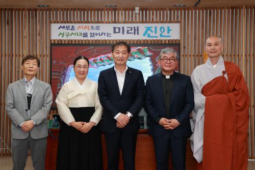 ±º¿¡ µû¸£¸é Àü ±º¼ö´Â ºÒ±³(´ëÇѺұ³Á¶°èÁ¾ ±Ý´ç»ç ÁÖÁö ´É¾ö), õÁÖ±³(õÁÖ±³ Àü±¹±³±¸ Áø¾È¼º´ç ÁÖÀӽźΠ±èÁøÈ), ¿øºÒ±³(¿øºÒ±³ Áø¾ÈÁö±¸Àå ¼Õ¿ÁÈñ), ±âµ¶±³(Áø¾È±º ±âµ¶±³ ¿¬ÇÕȸÀå ¼ÛÈñÁÖ) µî 4´ë Á¾´Ü Á¾±³ÁöµµÀÚµé°ú °£´ãȸ¸¦ °®°í, Äڷγª19 ¹æ¿ª¿¡ Àû±Ø µ¿ÂüÇØÁØ °Í¿¡ ´ëÇÑ °¨»çÀÇ ¸¶À½À» ÀüÇÑ µÚ Áø¾È ¹ßÀü°ú ±º¹ÎÈÇÕÀ» À§ÇÑ Çù·ÂÀ» ¿äûÇß´Ù.