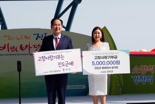 Áøµµ±º È«º¸´ë»çÀÎ ¼Û°¡ÀÎÀº 4³â ¸¸¿¡ ¿¸° Á¦43ȸ Áøµµ½ÅºñÀÇ¹Ù´å±æÃàÁ¦¿¡¼ °íÇâ»ç¶û±âºÎ±Ý ¿¬°£ ÃÖ´ë ÇѵµÀÎ 500¸¸¿øÀ» Àü´ÞÇØ È£ÆòÀ» ¹Þ¾Ò´Ù.