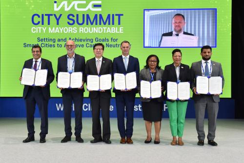 97°³ µµ½ÃµéÀÌ ¸ðÀÎ ±âÈÄÀ§±â ´ëµµ½Ã ÇùÀÇüÀÎ ¡®C40¡¯ ȸ¿øµµ½ÃÀÎ ¿ÀŬ·£µå´Â ÇØ¿î ź¼Ò¹èÃâ Àú°¨ Àü·«¿¡ ´ëÇØ ¼Ò°³Çϰí, ºÏÀ¯·´ ÇØ»ódz·Â ÇØ»óµµ½Ã ¿¡½ººñ¿¡¸£´Â ¿Â¶óÀÎÀ» ÅëÇØ µµ½Ã ¿©°Ç¿¡ ¸Â´Â Àå±âÀûÀÎ Àúź¼Ò ¹ßÀü Á¤Ã¥À» ÃßÁøÇÏ¿© ¿Â½Ç°¡½º °¨Ãà ¸ñÇ¥ ´Þ¼º ¹æ¾È¿¡ ´ëÇØ °øÀ¯ÇÑ´Ù.