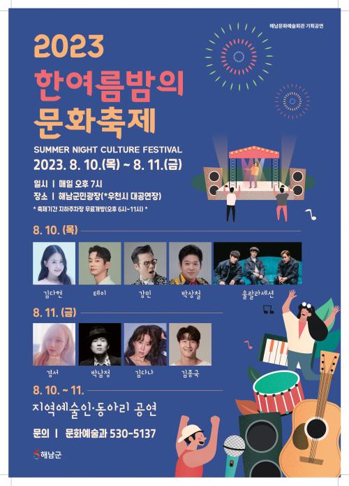ÇØ³²±ºÀº ¿À´Â 8¿ù 10~11ÀÏ ¿ÀÈÄ 7½ÃºÎÅÍ ÀαⰡ¼öµéÀÇ ¶ß°Å¿î ¹«´ë·Î ²Ù¸çÁö´Â 2023 ÇÑ¿©¸§¹ãÀÇ ¹®ÈÃàÁ¦¸¦ ±º¹Î±¤Àå Æ¯¼³¹«´ë¿¡¼ °³ÃÖÇÑ´Ù.