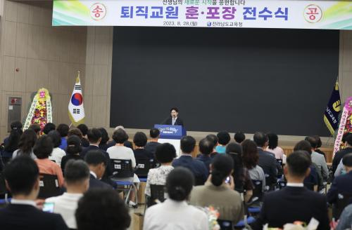 ±è´ëÁß ±³À°°¨Àº ¿µ¿¹·Î¿î ÈÆ․Æ÷ÀåÀ» ¹ÞÀº ¼ö»óÀÚ¿Í °¡Á·µé¿¡°Ô ±×µ¿¾ÈÀÇ Çå½Å°ú ³ë°í¿¡ Á¸°æ°ú °¨»çÀÇ ¸¶À½À» ÀüÇϸç, ¡°Àλý ÈĹÝÀüÀÇ Ãâ¹ßÀ» ÃàÇÏÇÏ°í ¾ÕÀ¸·Îµµ ¡®Àü³²±³À° ´ëÀüȯ¡¯ÀÇ ±æ¿¡ ¼±¹è ±³À°ÀÚµéÀÇ °æ·û°ú ÁöÇý¸¦ º¸ÅÂÁÙ °Í.¡±À» ´çºÎÇß´Ù.