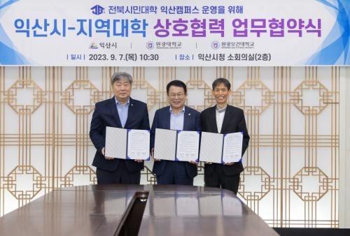 À̳¯ ¾÷¹«Çù¾à¿¡ Á¤ÇåÀ² ÀÍ»ê½ÃÀå°ú ¿ø±¤´ëÇб³ ¹Ú¼ºÅ ÃÑÀå, ¿ø±¤º¸°Ç´ëÇб³ ¹éÁØÈì ÃÑÀåÀÌ Âü¼®ÇÏ¿© ¶æÀ» ÇÔ²²Çß´Ù.