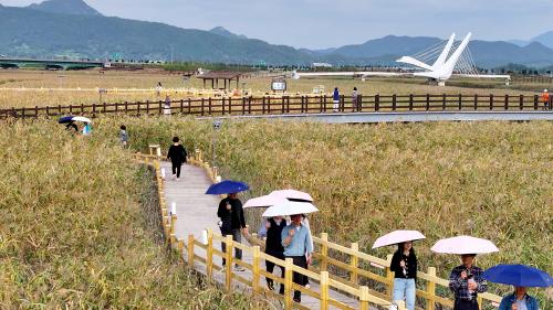 °¡À»±¹È Àü½ÃÀå¿¡¼ »ýÅÂÈ«º¸°ü ÂÊÀ¸·Î ´õ ³ª¾Æ°¡¸é 2.8haÀÇ ´ëÇü ÄÚ½º¸ð½º¹çÀÌ Á¶¼ºµÅ Èçµé¸®´Â °¥´ë¿Í ÇÔ²² Àå°üÀ» ÀÌ·ç¸ç, °È±â ÁÁ¾ÆÇÏ´Â °ü±¤°´µéÀ» À¯È¤Çß´Ù.