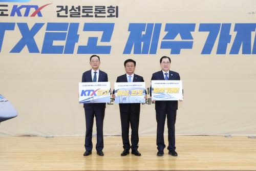 Áö³ 17ÀÏ ÇØ³²±º ¿ì½½µ¿¹éüÀ°°ü¿¡¼ À±Àç°© ±¹È¸ÀÇ¿ø ÁÖÃÖ, ÇØ³²±º, ¿Ïµµ±º °øµ¿ÁÖ°üÀ¸·Î ¼¿ï-Á¦ÁÖ °í¼Óöµµ(KTX) °Ç¼³ Åä·Ðȸ¡®KTX Ÿ°í Á¦ÁÖ°¡ÀÚ!¡¯°¡ °³ÃֵƴÙ.